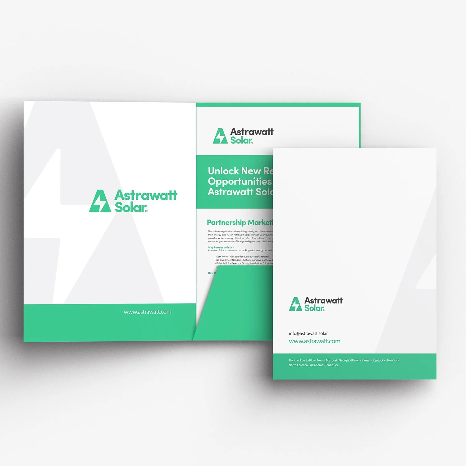 Branded folder design with sales collateral for Astrawatt Solar.